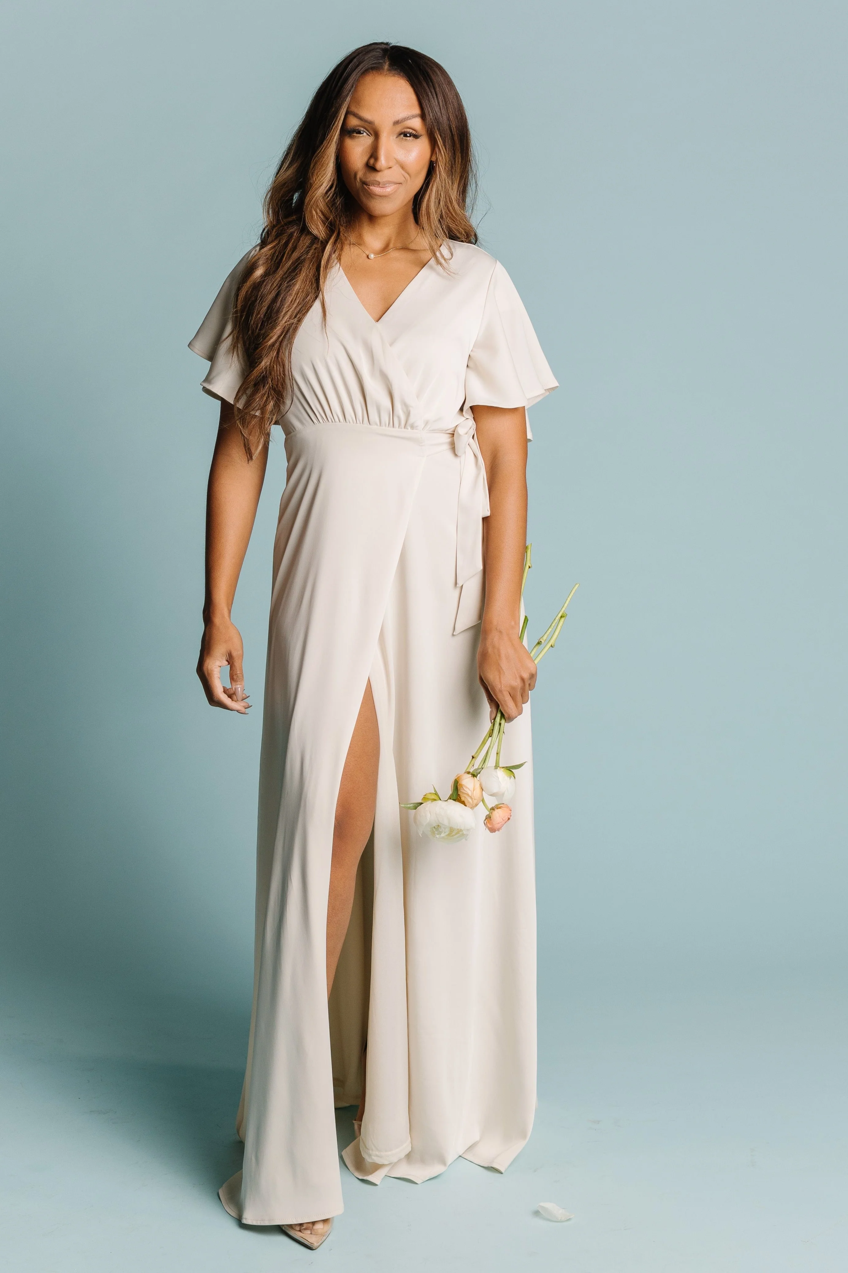Timelessly elegant, this chiffon maxi dress pairs a wrapped bodice with soft flutter sleeves and a flowy skirt that make a perfect combination for this flattering dress.