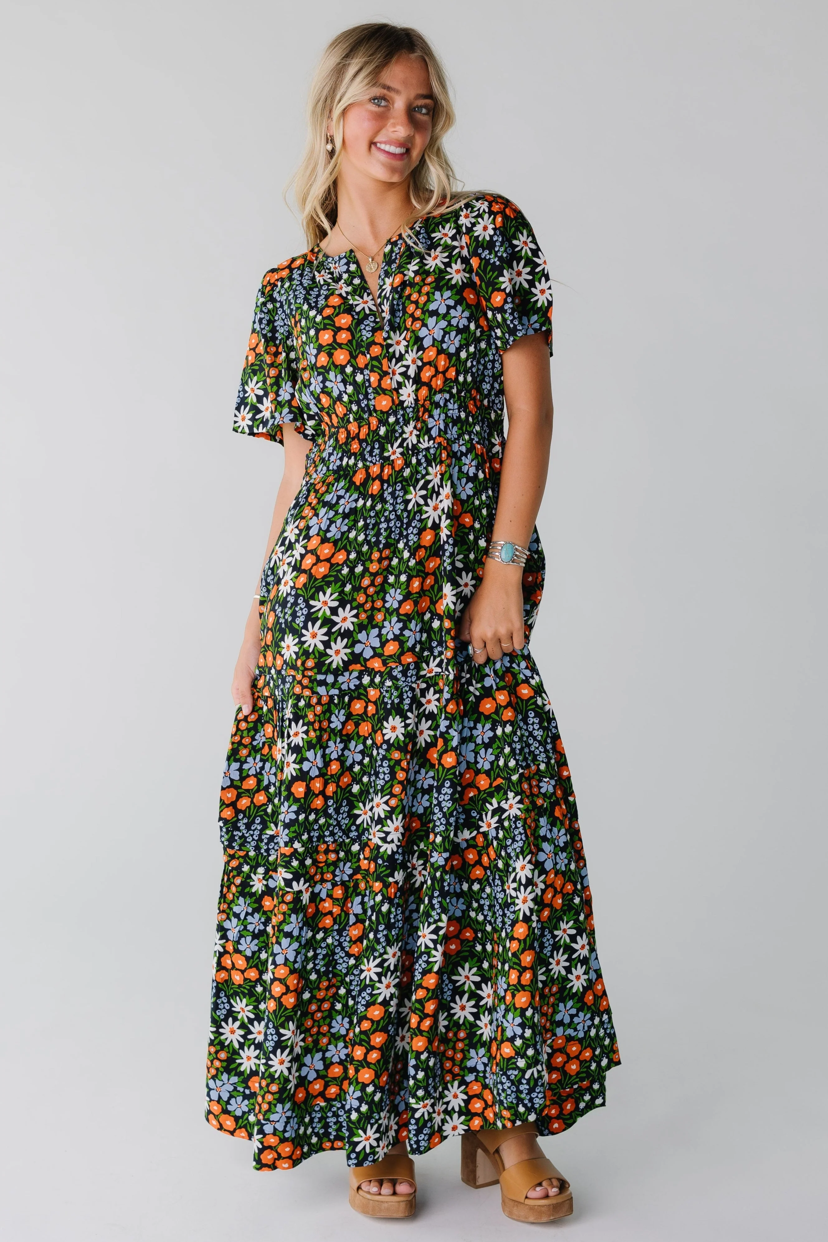 Bold floral print dress with triple banded elastic waist and modest maxi skirt